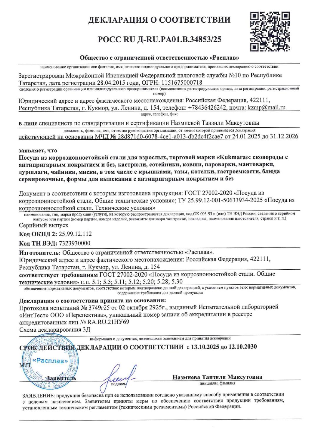 Декларация на посуду из нержавеющей стали ООО Расплав